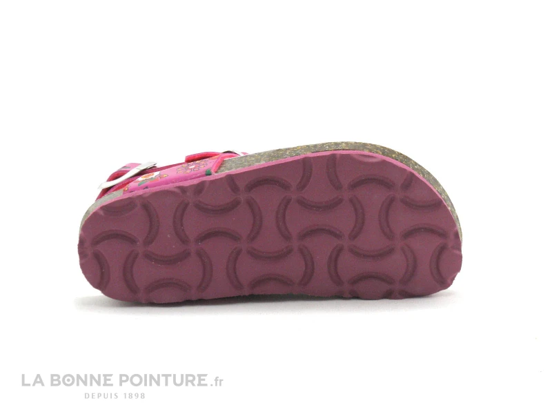 Cette chaussure d’été fillette est en simili cuir rose fuchsia à petites fleurs.