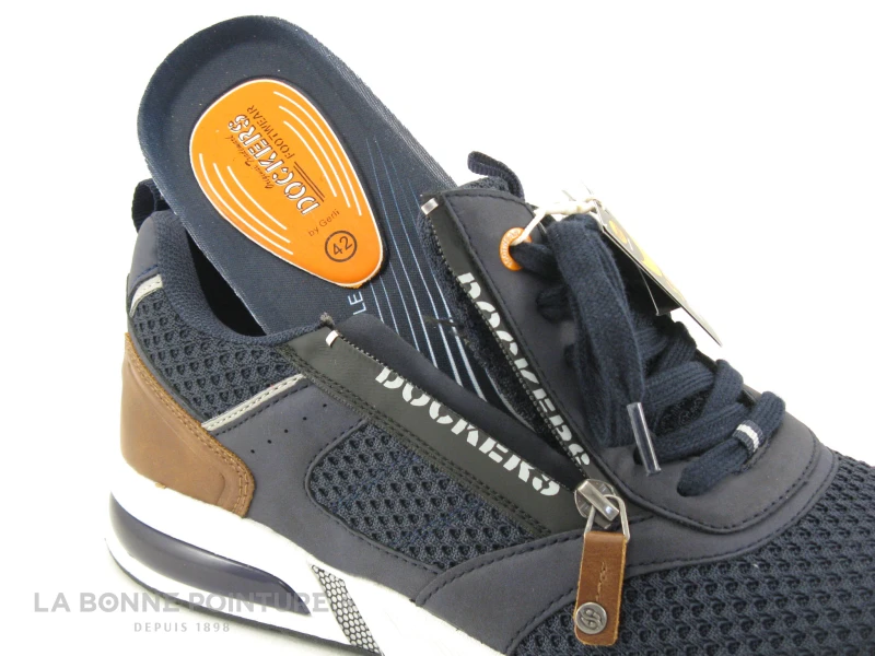 Ces belles sneakers Homme Dockers by Gerli 50FL005 sont principalement en maille bleu marine, avec du simili cuir marron.