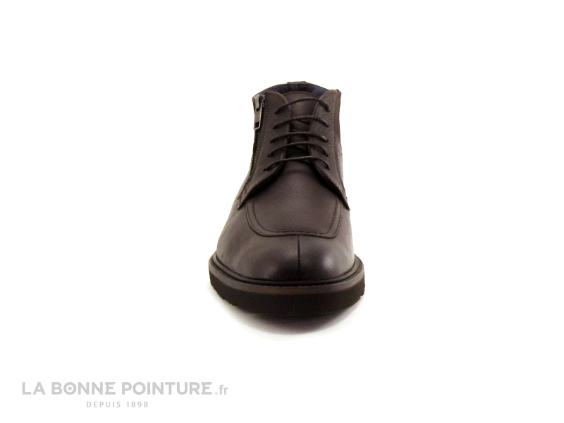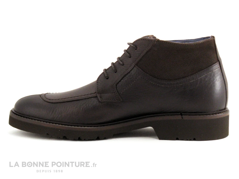 Cette chaussure montante est en cuir gras marron foncé, avec le tour de cheville en cuir velouté.