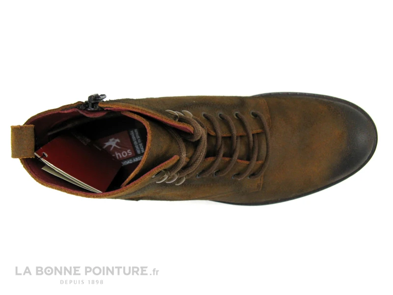 Le lacet marron traverse 4 oeillets et 3 crochets métalliques pour ajuster le bottillon Homme Fluchos Owen.
