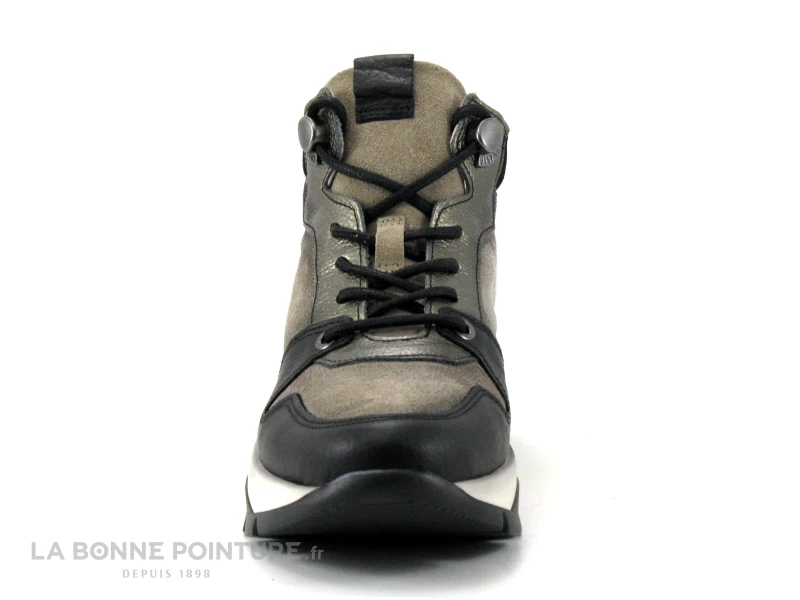 Cette basket montante Femme à semelle compensée est en cuir, combinant des parties noires et taupe velouté, noir grainé, et bronze métal.