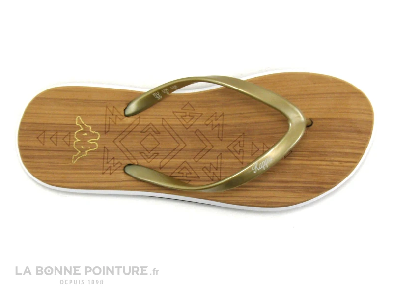 Ces tongs mode sont or (gold) avec la semelle beige façon bois, gravée de petites formes géométriques.