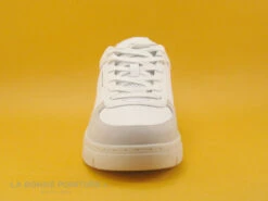 Le logo Kickers gris-bleuté s’affiche sur la bride de serrage de la cheville.
