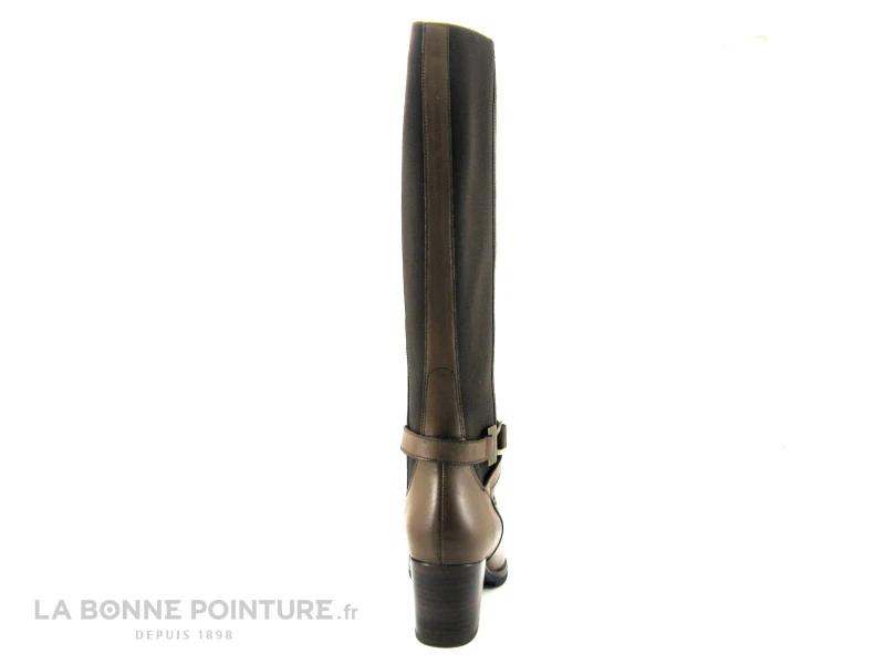 Cette botte à talon haut épais est en cuir lisse marron nuancé, avec deux bandes élastique à l’arrière pour ajouter de l’aisance dans la chaussure.