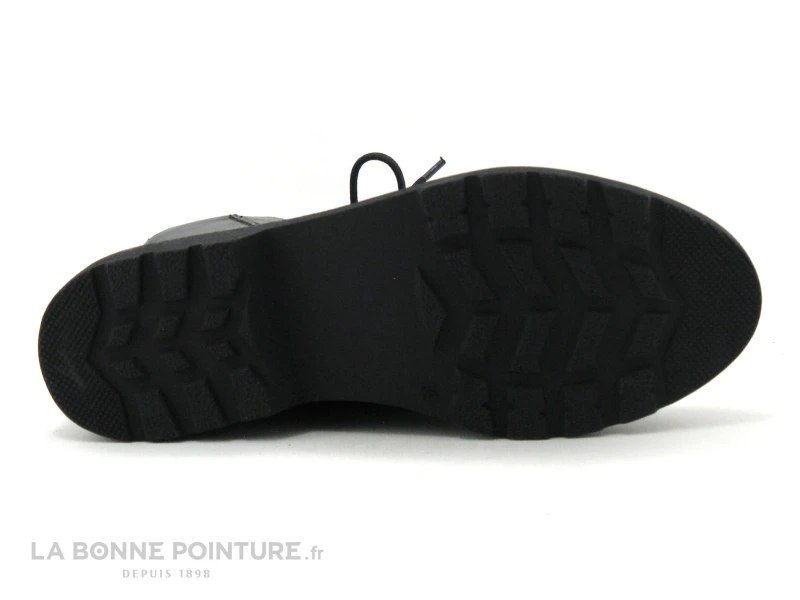 Cette bottine Femme à lacet est en cuir lisse noir, avec 5 oeillets de forme trapèze métallisés qui donnent de l’allure au modèle, traversés par un lacet rond noir.