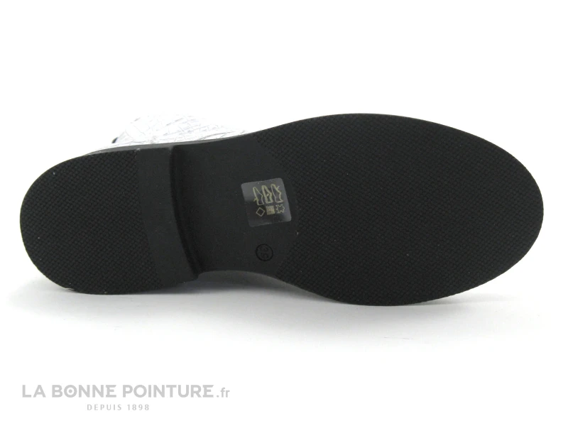 Cette chaussure montante originale est en cuir blanc effet croco, avec de petites touches de gris foncé sur les écailles.