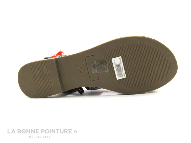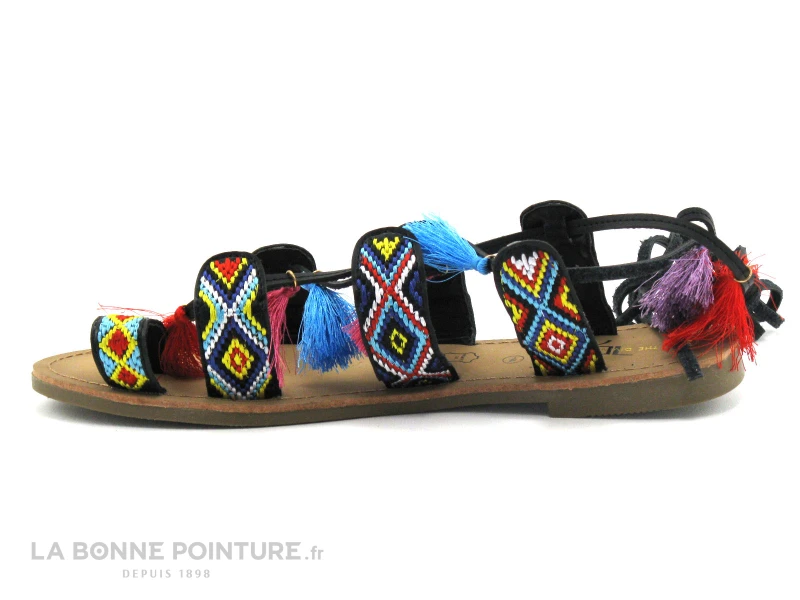 Cette tong à lacet est composée de brides et d’un passe-orteil noirs et tissés, avec des pompons multicolores.